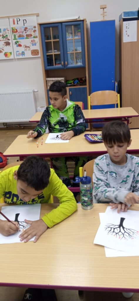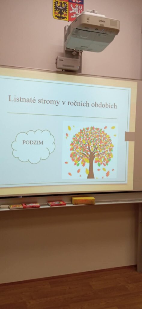 Na úvod žáci zhlédli PowerPointovou prezentaci, díky níž se dozvěděli, jak se stromy rozdělují, proč jsou pro nás důležité a co všechno se dá ze dřeva vyrobit. Poté se pustili do výtvarné činnosti – nakreslili si strom v podzimních barvách a učili se přiřazovat listy a plody ke správným druhům stromů.