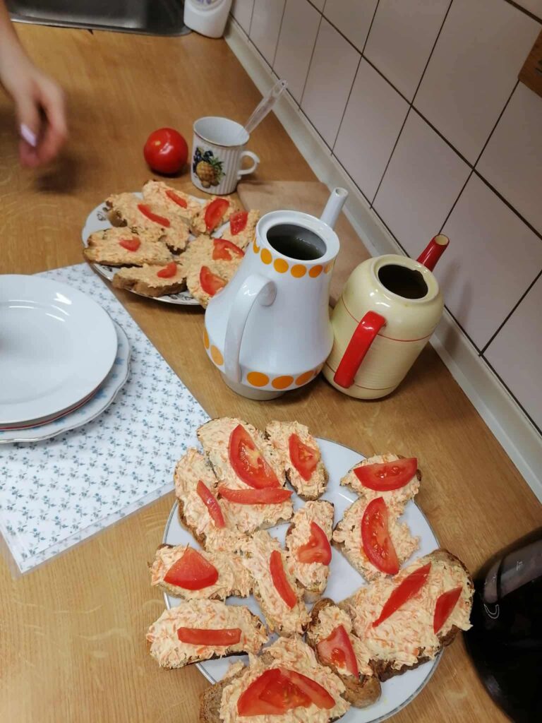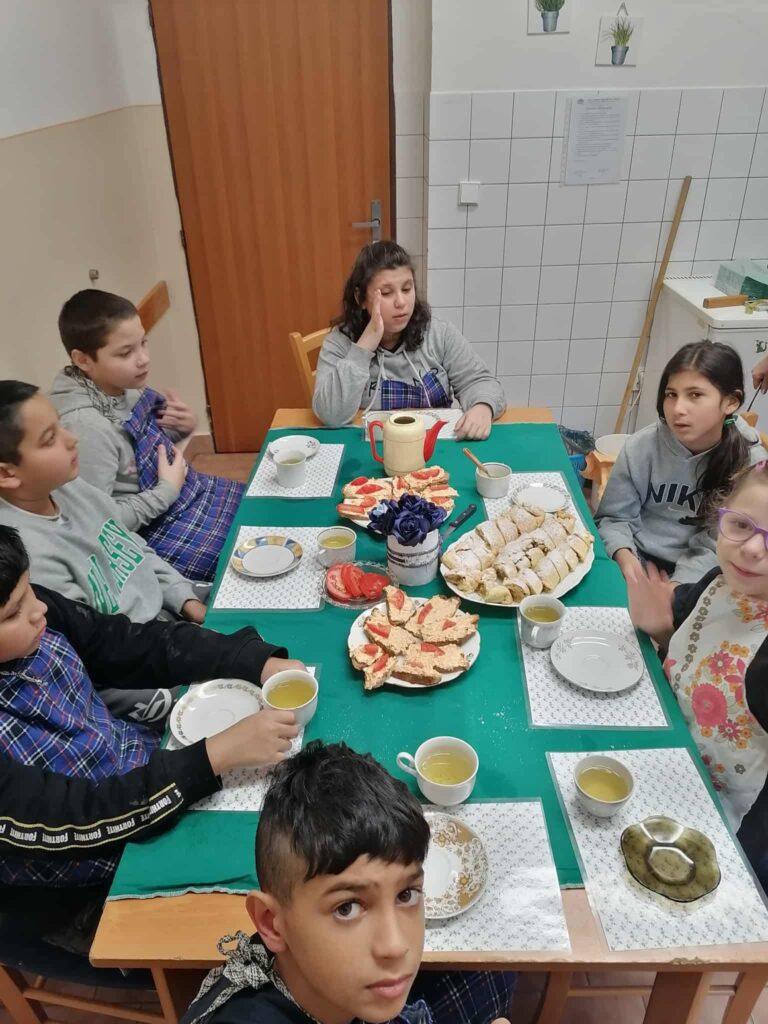 Ve skupinkách si děti vyrobily těsto i náplň. Všechno jsme společně nastrouhali, nakrájeli, namazali a uvařili k tomu i bylinkový čaj.